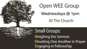 On Wednesdays @ 1:00pm, we have our Small Group Ministry called “Open WEE Group”. Everyone is welcome. Our main focus in getting together is three fold: 1) To further discuss Sundays sermon and how it applies to our life 2) To be an encouragement to one another 3) To elevate one another through prayer.